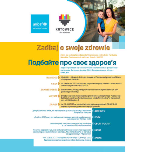 Urząd Miasta Katowice zaprasza obywatelki Ukrainy przebywające w Polsce w związku z konfliktem zbrojnym prowadzonym na Ich terytorium do udziału w bezpłatnych badaniach i szczepieniach.